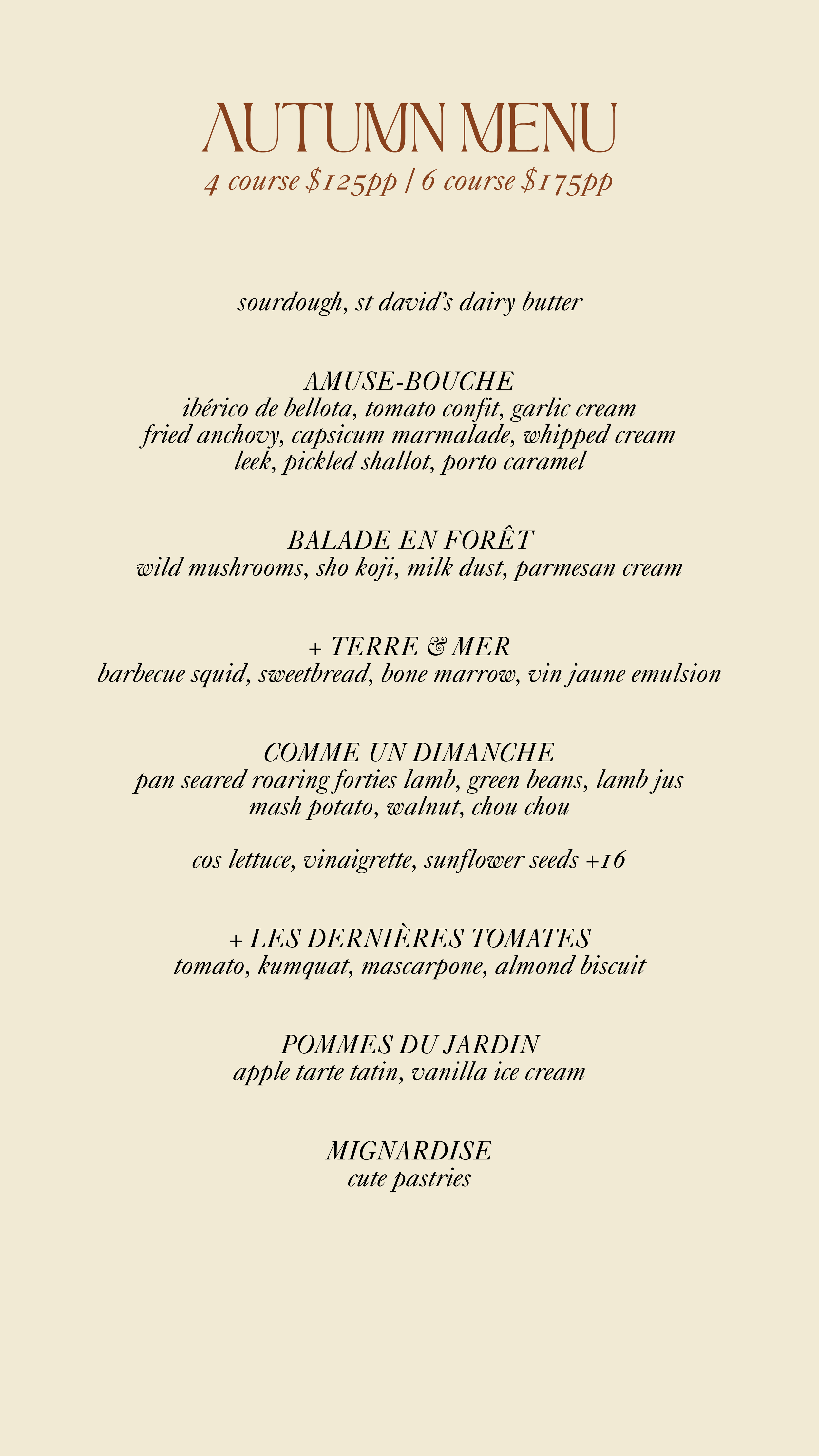 This menu is available as a four or six course experience, with dishes marked with a + exclusive to the six.